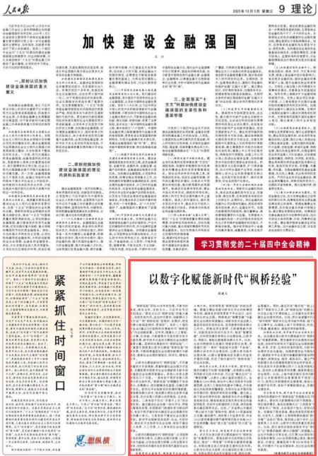 “枫桥经验”历经60余年的发展,不断与时俱进,焕发生机,发扬光大。习近平总书记深刻指出:“要充分认识‘枫桥经验’的重大意义,发扬优良作风,适应时代要求,创新群众工作方法”“把‘枫桥经验’坚持好、发展好,把党的群众路线坚持好、贯彻好”。党的二十届四中全会《建议》对坚持和发展新时代“枫桥经验”作出战略部署。近年来,随着以人工智能、云计算、区块链、大数据等为代表的数字技术迅猛发展,数字技术日益成为赋能社会治理的重要力量。坚持和发展新时代“枫桥经验”,一个重要方面就是以数字化赋能“枫桥经验”创新发展,不断探索基层社会治理的新模式与新路径,提高社会治理的智能化、科学化、精准化水平。