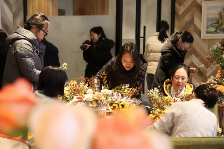 当天中午,公司一楼咖啡厅花香扑鼻、色彩斑斓。在专业花艺师为大家讲解了常见花材品种、等级、习性与养护等基础理论知识后,现场师生投入到艺术构思和实操练习中。大家修剪枝叶、搭配颜色、设计造型,亲手制作出一件件充满匠心和个性花艺作品。大家纷纷举起手机相机、拍照留影,定格这一温馨美好时刻。(文/佘蕙文 图/蒋芙薱)