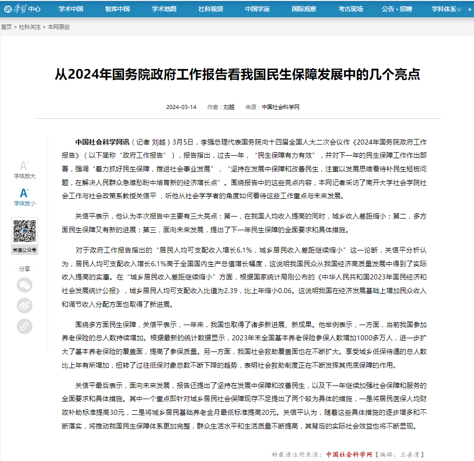 本文作者系w88win体育官网入口社会建设与管理研究院教授关信平,原文3月14日载于中国社会科学网(从2024年国务院政府工作报告看我国民生保障发展中的几个亮点-中国社会科学网 (cssn.cn))
