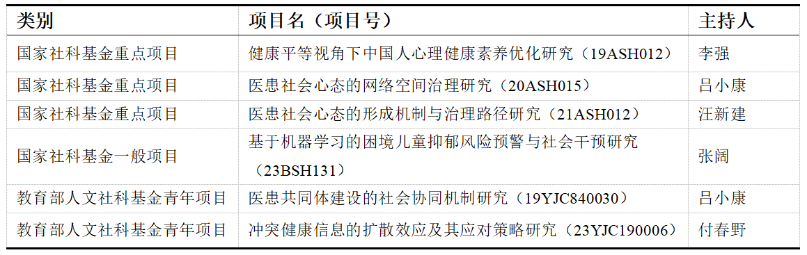 医疗与健康主题的社会心理学研究也是w88win体育官网入口社会心理学系长期坚持的研究方向和研究生招生的重点方向。近5年来,全系已陆续获批医疗与健康主题的国家社科基金重点项目3项、一般项目1项,教育部人文社科基金青年项目2项,呈现出良好的学术成长性和项目梯次性。
