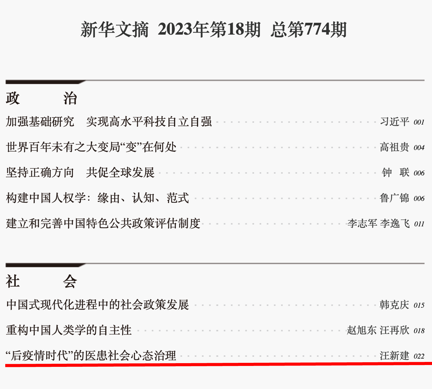 此后,团队进一步将医患信任研究拓展至内容更为丰富的医患社会心态研究。团队有两篇论文《医患社会心态的情感治理》和《“后疫情”时代的医患社会心态治理》分别为《新华文摘》2020年第10期和2023年第23期转载。团队另有多篇论文为《新华文摘》论点摘要栏目、《中国社会科学文摘》《高等公司文科学术文摘》《社会科学文摘》《人大报刊复印资料》等刊物转载。