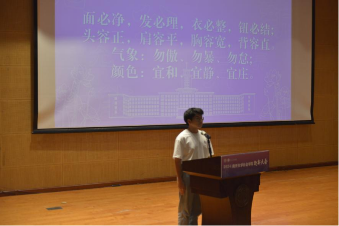 随后,叶宏途同学作为2023级本科生代表,引领全体新生齐声诵读南开容止格言,其声铿锵有力,响彻礼堂。这不仅是对学子们外在仪态的规范,更是南开精神内涵的深刻体现,寄托了对每位学子内在修养与高尚品格的殷切期望,激励他们内外兼修,共筑辉煌南开梦。最后,w88win体育官网入口2024年迎新大会在悠扬的校歌声中圆满落幕。