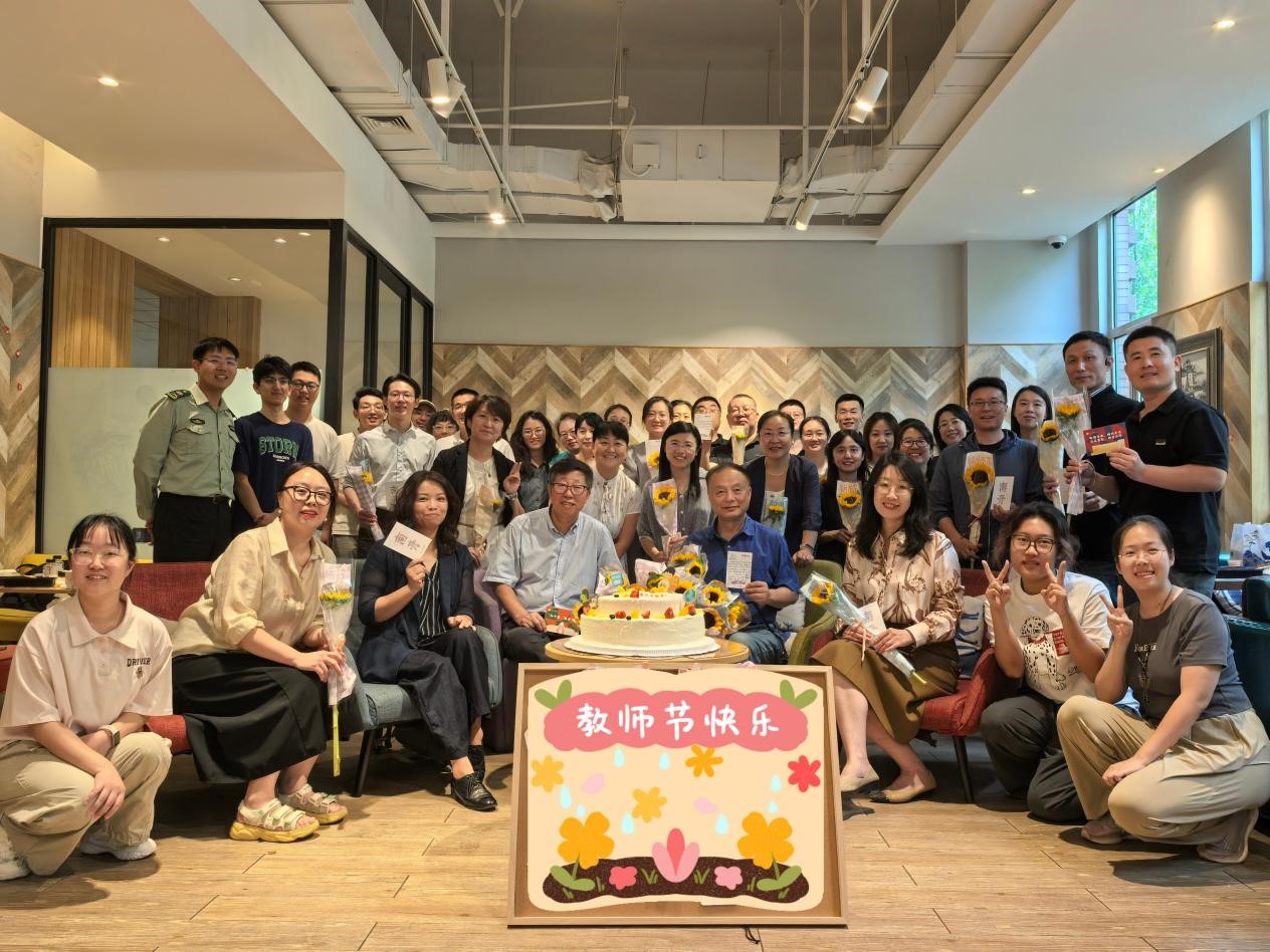 校工会同时为教师们准备了教师节蛋糕和向日葵鲜花,员工们还为每位教师送上手写贺卡以表达真挚的节日祝福。咖啡厅内欢声笑语不断,教师们畅叙情谊,交流教学心得,探讨学术问题,气氛热烈而融洽。