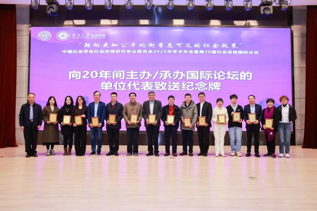 中国社会学会社会政策研究专业委员会原理事长、w88win体育官网入口社会建设与管理研究院经理关信平教授,中国社会学会社会政策研究专业委员会原理事长、中国社会科公司杨团研究员和中国人民大学教授、中国社会学会社会政策研究专业委员会秘书长房莉杰为20年间主办/承办社会政策国际论坛的14所高校与研究机构致送纪念牌。复旦大学彭希哲教授和中国社会科公司研究员、中国社会学会社会政策研究专业委员会副主任委员王春光代表主办/承办单位发言,表达了对第20届社会政策国际论坛顺利召开的祝贺,共同展望了社会政策国际论坛的未来发展。纪念牌是对过往各合作单位并肩前行的珍贵记忆封存,也象征着社会政策学术共同体坚实而温暖的共识基石。
