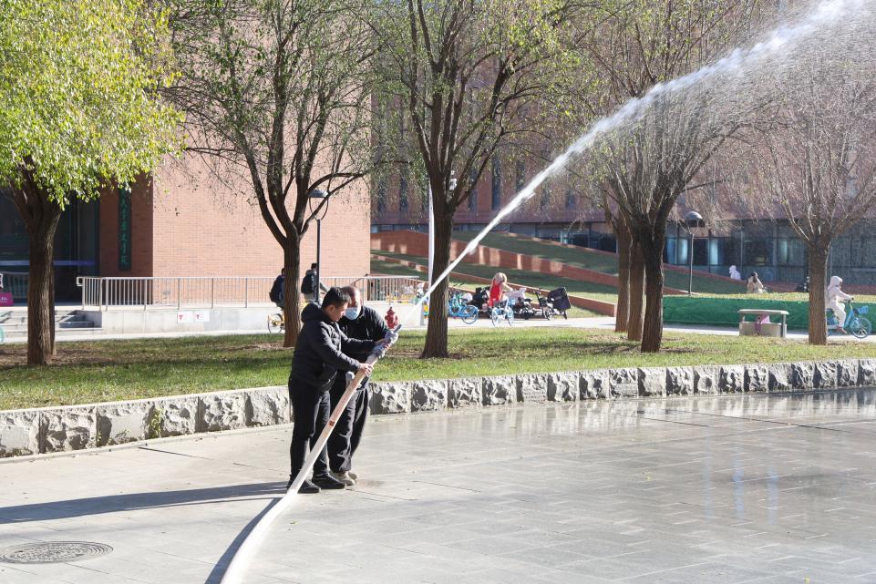 疏散集结后,保卫处工作人员在空旷地区演示了灭火毯覆盖灭火、消防栓水带连接以及消防栓出水等关键技能,直观展示出消防设备的实际效果和灭火能力。随后,师生代表在保卫处指导下进行实操训练,现场使用干粉灭火器扑灭模拟火源,并演练灭火毯覆盖、消防栓出水等科目。参与师生表示,通过亲身体验掌握了"提拔握压"灭火器操作口诀,对消防设备使用有了更直观的认识。