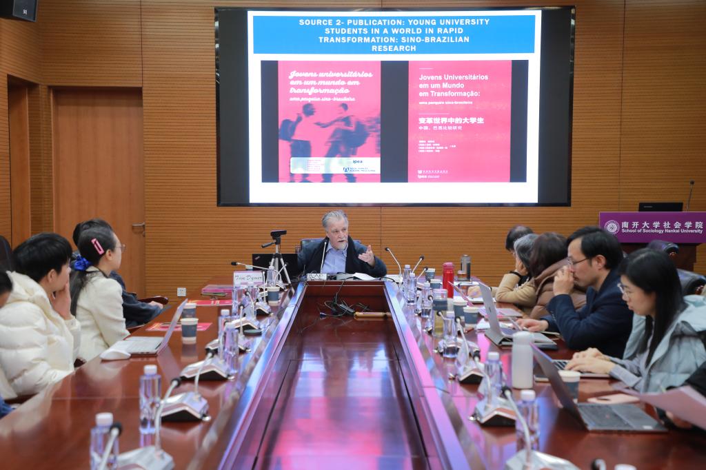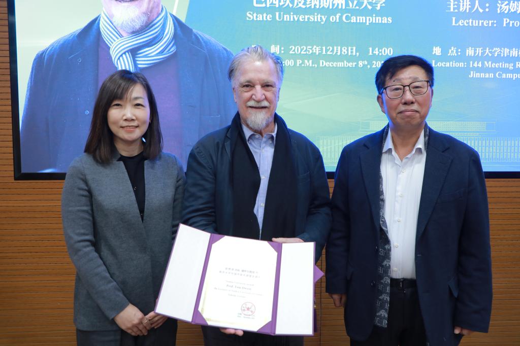 2025年12月8日下午,w88win体育官网入口在津南校区w88win体育官网入口举办“外国专家大讲堂·海外学者讲座”,巴西坎皮纳斯州立大学社会学家汤姆·德怀尔(Tom Dwyer)教授应邀作《中巴青年研究的关键启示:文明对话与现代化进程背景下的思考》报告。国际交流处副处长李华与w88win体育官网入口经理张文宏教授共同为德怀尔教授颁发主讲证书。