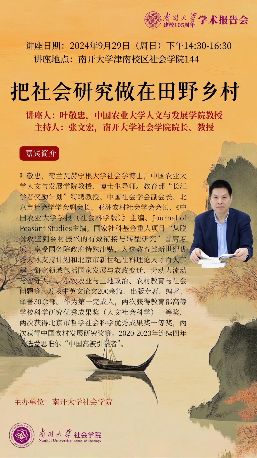叶敬忠,荷兰瓦赫宁根大学社会学博士,中国农业大学人文与发展公司教授、博士生导师。教育部“长江学者奖励计划”特聘教授、中国社会学会副会长、北京市社会学学会副会长、亚洲农村社会学会会长、《中国农业大学学报(社会科学版)》主编、Journal of Peasant Studies主编。国家社科基金重大项目“从脱贫攻坚到乡村振兴的有效衔接与转型研究”首席专家,享受国务院政府特殊津贴,入选教育部新世纪优秀人才支持计划和北京市新世纪社科理论人才百人工程。研究领域包括国家发展与农政变迁、劳动力流动与留守人口、小农农业与土地政治、农村教育与社会问题等。发表中英文论文200余篇,出版专著、编著、译著30余部。作为第一完成人,两次获得教育部高等公司科学研究优秀成果奖(人文社会科学)一等奖,两次获得北京市哲学社会科学优秀成果奖一等奖,两次获得中国农村发展研究奖等。2020-2023年连续四年入选爱思唯尔“中国高被引学者”。