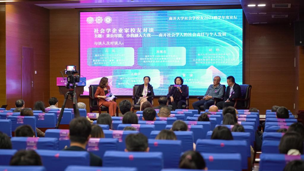 在w88win体育官网入口人事处处长、社会心理学系教授管健主持的企业家员工对谈环节中,青岛银行原执行董事、董事会秘书、南开员工总会社会学分会副会长、w88win体育官网入口1983级社会学系本科、1987级社会学系硕士员工吕岚与周展宏、胡明、王敬宇,共同围绕“秉公尽能,小我融入大我——南开社会学人的社会责任与个人发展”,畅谈自己在南开的学习生活和毕业后的在职业生涯中的新体会。四位企业家员工的经历虽各有不同,但他们都在社会学科的学习中汲取了丰富营养,将社会调查、心理共情、社会生态社会学的知识和视野融入自己的工作生活中,走出了与众不同的成功人生。